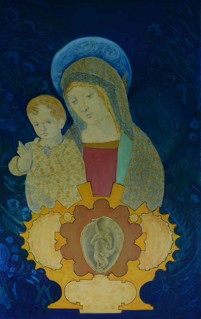 pastel, guache, ink, oil, fabric, and a found object from popular culture on canvas